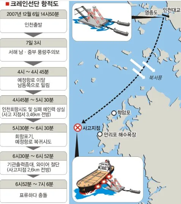 정박 중이던 허베이 스피리트호에 삼성중공업이 소유한 크레인 바지선이 강풍으로 인해 연결 로프가 끊어지며 충돌 → 유조선에 3개의 구멍이 나면서 **총 12,547㎘(킬로리터)**의 원유 유출
