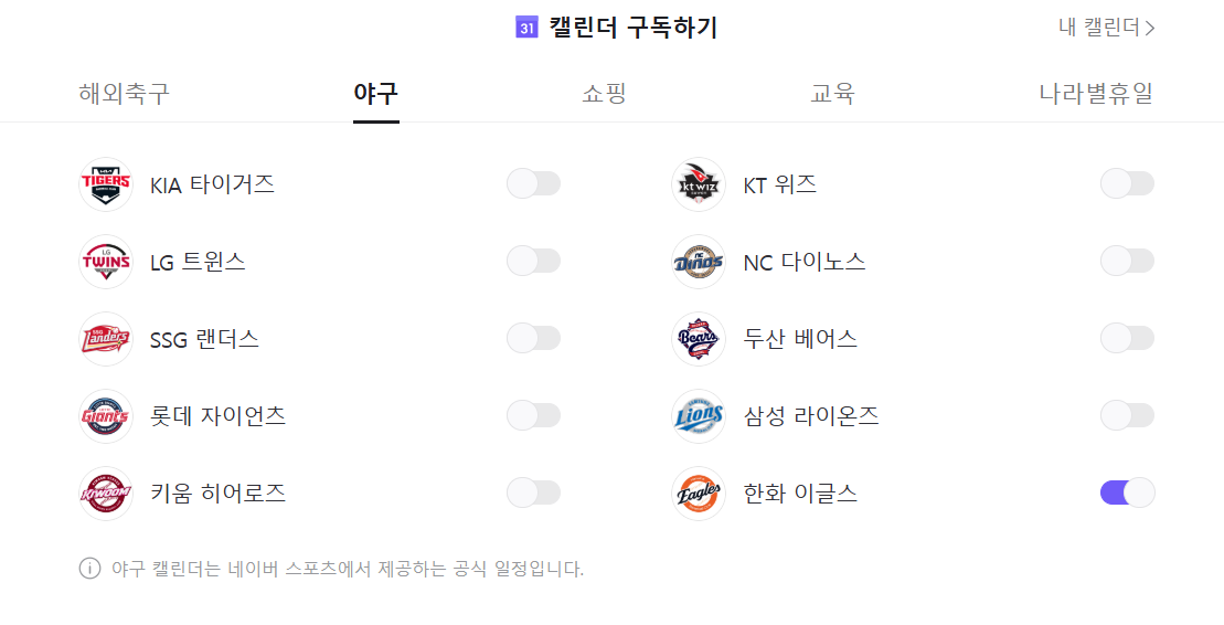 구글버전과 네이버캘린더 2가지 버전입니다. 다만, 구글캘린더는 한국프로야구는 현재 구독이 불가하며,